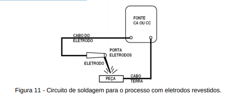 Uma das razões para a grande aceitação do processo SMAW é a simplicidade do equipamento necessário. O equipamento de soldagem consiste na fonte de energia, no porta-eletrodos (tenaz) e nos cabos e conexões (veja a Figura 11)