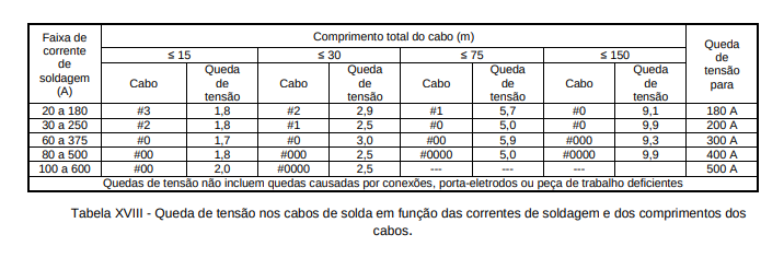 Cabos de solda - O cabo do eletrodo e o cabo terra são partes importantes do circuito de soldagem. Eles devem ser muito flexíveis e ter um bom isolamento resistente ao calor. As conexões no porta-eletrodo, o terminal terra e os terminais da fonte de energia devem ser soldados ou bem prensados para assegurar baixa resistência elétrica. O diâmetro do cabo deve ser suficiente para conduzir a corrente elétrica com um mínimo de queda de tensão. O aumento no comprimento do cabo torna necessário o aumento em seu diâmetro para diminuir a resistência elétrica e a queda de tensão. A Tabela XVIII lista os diâmetros de cabo sugeridos para diversas correntes de soldagem e comprimentos de cabo.