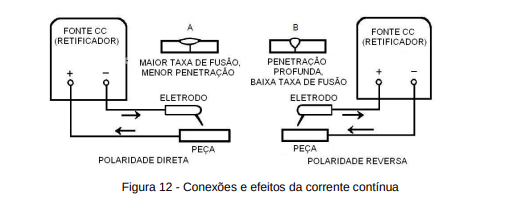 Quando se emprega uma fonte CC aparece a questão do uso da polaridade negativa ou positiva. Alguns eletrodos funcionam com CC+ e com CC-, e outros somente com CC+ ou somente com CC-. A corrente contínua flui numa direção no circuito elétrico, e esse fluxo unidirecional e a composição do revestimento do eletrodo terão um efeito preciso no arco e no cordão de solda. A Figura 12 mostra as conexões e os efeitos das polaridades direta (CC-) e reversa (CC+).