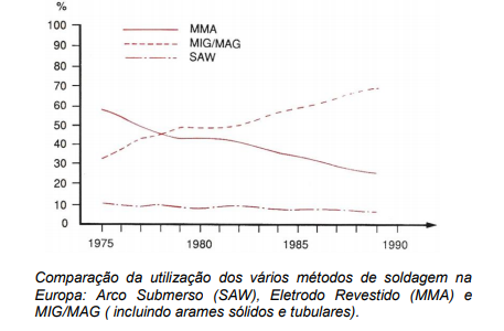 Todas estas melhorias permitiram um aumento na velocidade de soldagem do processo MIG/MAG em relação a outros processos, e isso vem refletindo-se na evolução da utilização do mesmo, comparativamente aos processos mais antigos, conforme quadro abaixo: