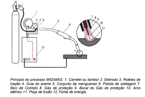 MIG é um processo por fusão a arco elétrico que utiliza um arame eletrodo consumível continuamente alimentado à poça de fusão e um gás inerte para proteção da região de soldagem. MAG é um processo de soldagem semelhante ao MIG, porém utilizando um gás ativo (CO2) para proteção da região de soldagem. Em ambos os processos geralmente o metal de adição possui a mesma composição química do metal base. O processo MIG baseouse no processo TIG, iniciando com a soldagem do Alumínio e posteriormente estendeu-se à soldagem dos aços inoxidáveis, ao se notar que uma pequena adição de O2 ao gás inerte facilitava a abertura do arco.