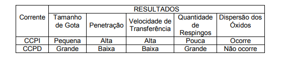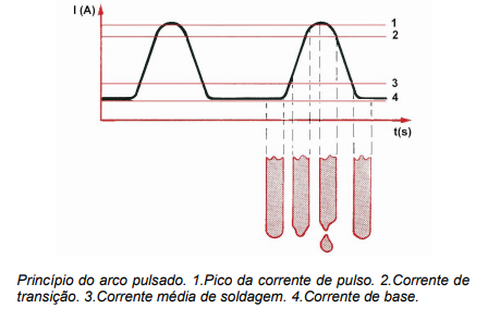 - Arco mantido por uma corrente baixa principal com sobreposição de pulsos de alta corrente e transferência por spray durante os pulsos.