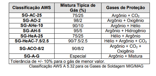 A especificação AWS A 5.32 se aplica aos gases de proteção utilizados nos processos de soldagem MIG/MAG, TIG, ARAME TUBULAR e PLASMA. Os gases de proteção podem ser de um único tipo de gás (puro) ou de mistura de gases.