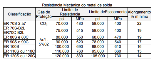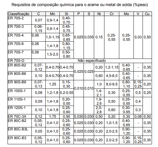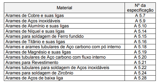 A tabela abaixo relaciona as especificações AWS de arames para soldagem MIG/MAG de diferentes materiais.