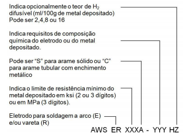 A principal especificação para os arames-eletrodos é a AWS A 5.18 que prescreve os requerimentos para a classificação de eletrodos sólidos ou compostos (arame tubular com núcleo metálico – metal cored) e varetas para os processos MIG/MAG (GMAW), TIG (GTAW) e PLASMA (PAW) na soldagem de aço carbono. A classificação dos arames para soldagem de aços pelas especificações AWS A 5.18 e A 5.28, que engloba os arames sólidos e os arames com enchimento metálico, tem o formato abaixo.