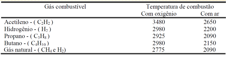 - combustível: acetileno, GLP, gás natural, hidrogênio, etc,