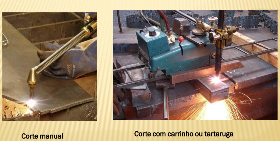 O outro, acionado por um gatilho, separado, acrescenta mais oxigênio à mistura dos gases, para formar uma chama altamente oxidante, que vai efetuar o corte.