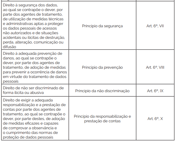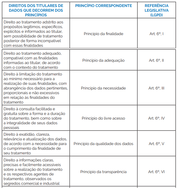 Os direitos a serem garantidos aos titulares dos dados estão organizados nas tabelas a seguir , as quais estão segregadas em direitos decorrentes dos princípios estabelecidos pelo art. 6º da LGPD e em direitos específicos dos titulares constantes dos demais artigos da referida Lei.