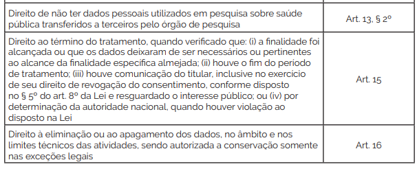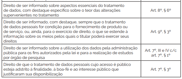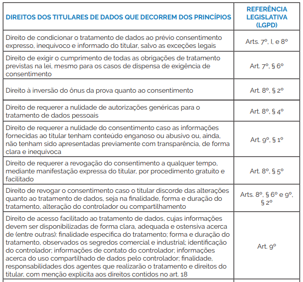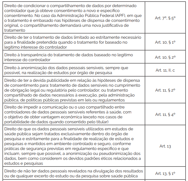 Além dos direitos dos titulares de dados que são decorrentes do art. 6º da LGPD, a Lei apresenta diretos específicos dos titulares de dados, que são destacados na tabela abaixo.
