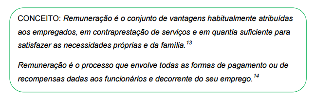 A Remuneração é o valor, a importância, paga pela empresa ao funcionário como contraprestação de seus serviços. A remuneração difere do conceito de salário, pois a remuneração é o gênero, e o salário é uma de suas espécies.