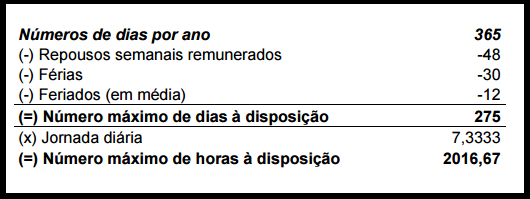 Supondo a semana com trabalho de seis dias, portanto, sem a compensação dos sábados, e considerando o regime constitucional de 44 horas semanais, chega-se à conclusão de que o dia comum trabalhado possui 44/6 = 7,3333 horas ou 7h e 20min.
