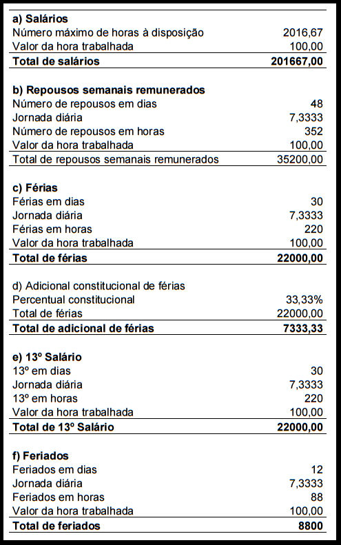 Supondo um salário por hora igual a $100,00, o cálculo do total do salário mais benefícios e encargos pode ser determinado na tabela a seguir: