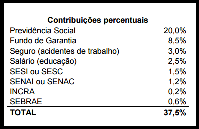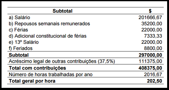 Assim, um salário básico de $100,00 por hora revela que, após serem acrescidas todas as contribuições e encargos, resultará um total igual a $202,50. Portanto, um acréscimo de 102,5% ao valor original.