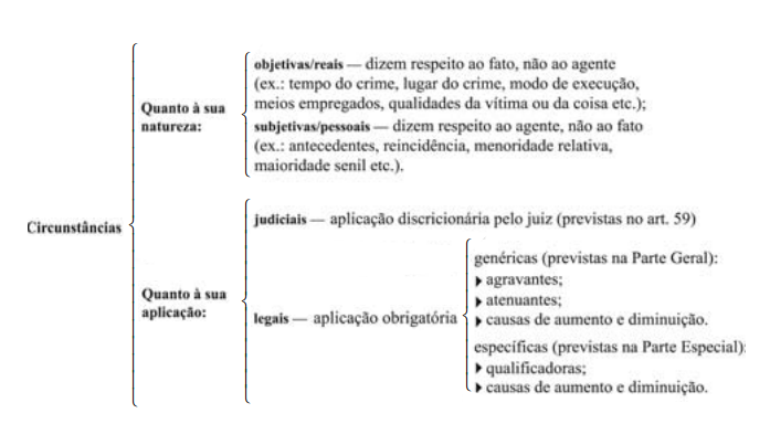 Circunstância: é todo dado secundário e eventual agregado à figura típica, cuja ausência não influi de forma alguma sobre a sua existência. Tem a função de agravar ou abrandar a sanção penal e situa-se nos parágrafos.