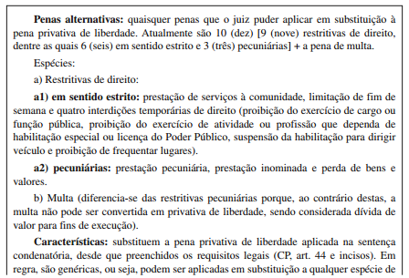 Penas alternativas: constituem toda e qualquer opção sancionatória oferecida pela legislação penal para evitar a imposição da pena privativa de liberdade. Ao contrário das medidas alternativas, constituem verdadeiras penas, as quais impedem a privação da liberdade. Compreendem a pena de multa e as penas restritivas de direitos.