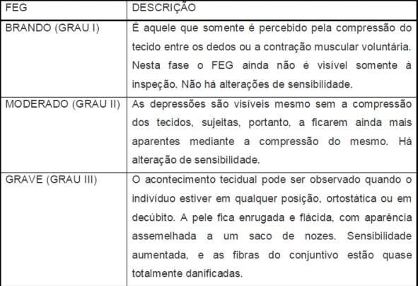 No que se refere á anatomia patológica do FEG, Lageze apud Guirro e Guirro (2004) a descreveu e a subdividiu em quatro fases. Foi o primeiro a ter descrito tal anatomia, complementando os achados histológicos apresentados por outros autores, veja a tabela 01 a seguir.Conforme Guirro e Guirro (2002), as lesões teciduais surgem em três estágios, subdivididos segundo a gravidade de cada um, FEG brando (grau I), FEG moderado (grau II) e FEG grave (grau III), de acordo com a tabela 02. De acordo com o autor, o FEG brando é sempre curável, o moderado é frequentemente curável e o grave é considerado como incurável, ainda que passível de melhora.