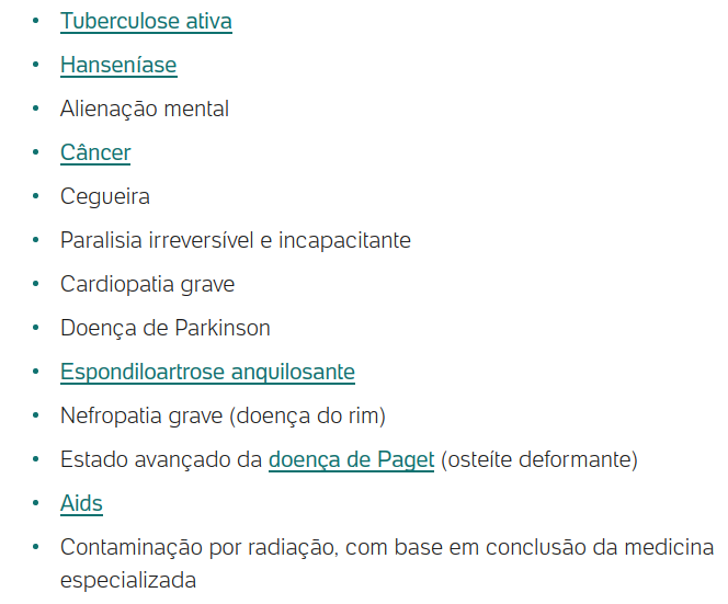 Doenças que não exigem um mínimo de contribuições Além da incapacidade, para se aposentar por invalidez é preciso cumprir um período de carência de 12 contribuições. Ou seja, precisa ter contribuído ao INSS por pelo menos 12 meses para poder acessar esse benefício. Algumas doenças consideradas graves, contagiosas ou incuráveis, porém, estão previstas em lei e, além de garantir a aposentadoria, não é preciso cumprir a carência nesses casos. São elas: