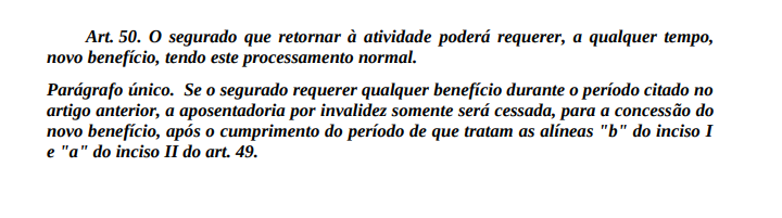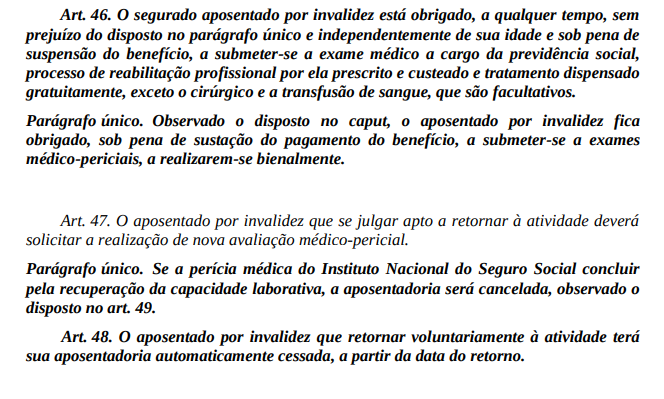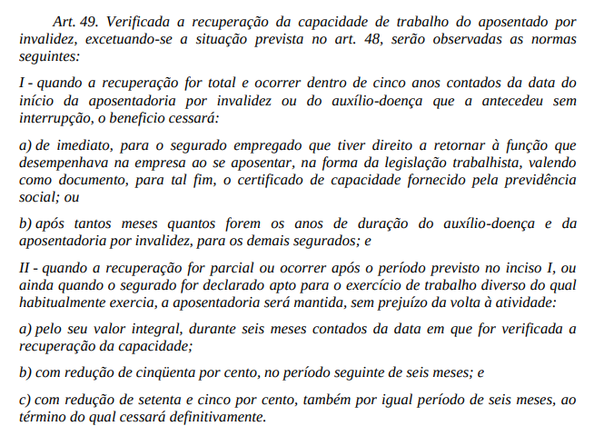 Ademais, se a perícia médica do INSS concluir pela recuperação da capacidade laborativa do paciente, a aposentadoria por invalidez que lhe havia sido concedida será cancelada, conforme as disposições legais pertinentes. No mesmo sentido, o aposentado por invalidez que retornar voluntariamente à atividade terá sua aposentadoria automaticamente cessada, a partir da data do retorno, sendo certo, por outro lado, que nada impede que o paciente possa requerer, a qualquer tempo, um novo benefício.