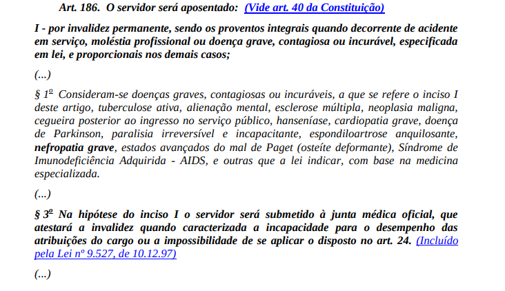 Por fim, no caso especial dos servidores públicos , o regime jurídico a que se submetem segue as disposições contidas na Lei Federal nº 8.112, de 11 de dezembro de 1990, a qual estipula que a aposentadoria por invalidez permanente será conferida, com proventos integrais, em decorrência de acidente em serviço, moléstia profissional ou doença grave, contagiosa ou incurável, especificada em lei, mesmo se o servidor não apresentar tempo completo de serviço. Para os fins do presente estudo, vale mencionar que a lei relaciona como sendo doença grave a nefropatia grave (para a lista completa, vide item A2 abaixo, transcrição do art. 186, parágrafo 1º).