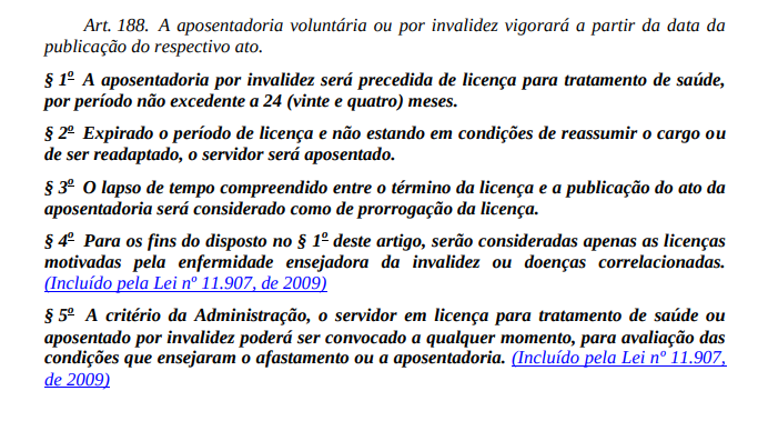 Portanto, no caso da aposentadoria por invalidez de servidor público, haverá, primeiramente, a concessão de licença para tratamento de saúde, por período não excedente a vinte e quatro meses, sendo que, expirado esse período e não estando em condições de reassumir o cargo ou de ser readaptado, o servidor será aposentado. Por último, vale ressaltar, aqui, que serão consideradas apenas as licenças motivadas pela enfermidade ensejadora da invalidez ou doenças correlacionadas.