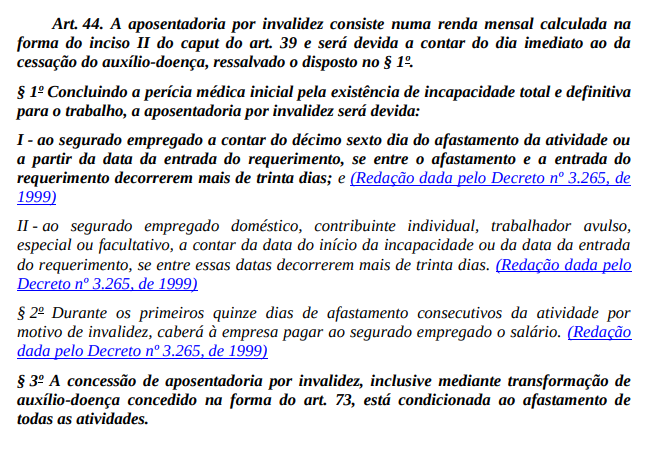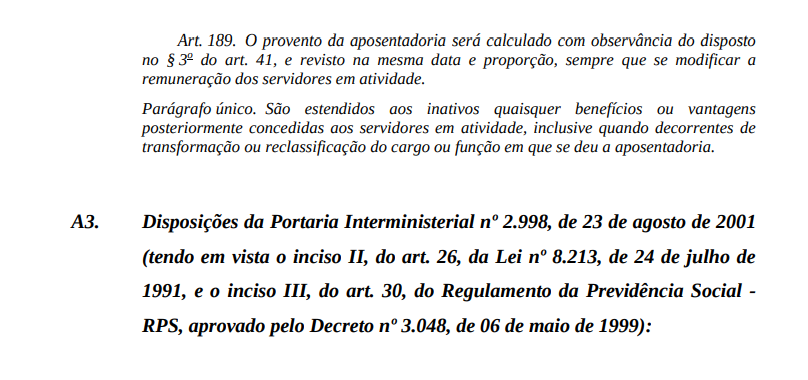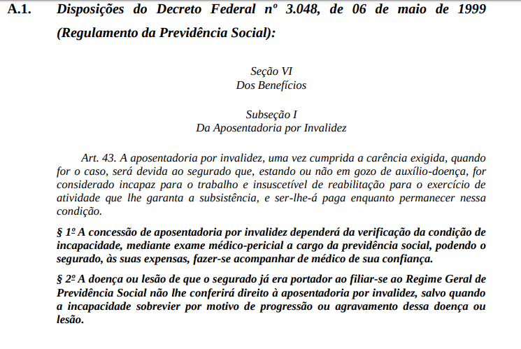 Decreto Federal nº 3.048, de 06 de maio de 1999 (Regulamento da Previdência Social), que regulamentou a Lei Federal nº 8.122, de 24 de julho de 1991 (Lei Orgânica da Seguridade Social); Lei Federal nº 8.112, de 11 de dezembro de 1990 (Regime Jurídico dos Servidores Públicos Civis da União, das autarquias, inclusive as em regime especial, e das fundações públicas federais); e Portaria Interministerial nº 2.998, de 23 de agosto de 2001 (tendo em vista o inciso II, do art. 26, da Lei nº 8.213, de 24 de julho de 1991, bem como o inciso III, do art. 30, do Regulamento da Previdência Social - RPS, aprovado pelo Decreto nº 3.048, de 06 de maio de 1999).
