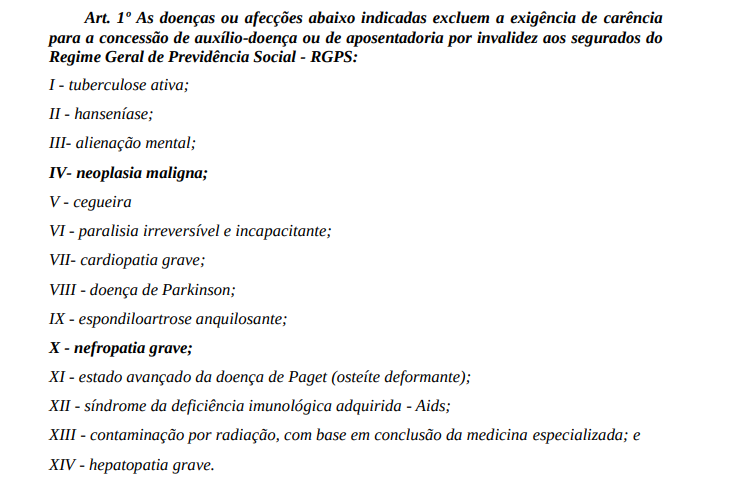 Outro ponto relevante a ser exposto é que a Portaria Interministerial nº 2998, de 23/08/2000, expedida pelos Ministérios da Previdência e Assistência Social e da Saúde, determina que os portadores de nefropatia grave (entre outras doenças crônicas como, por exemplo, a neoplasia maligna) não se submetem ao período de carência, que é o número mínimo de contribuições previdenciárias necessárias para que o segurado tenha direito à aposentadoria por invalidez. No entanto, a exigência de que o segurado tenha se filiado à Previdência Social antes de ser acometido pela doença ou afecção permanece sendo exigida.