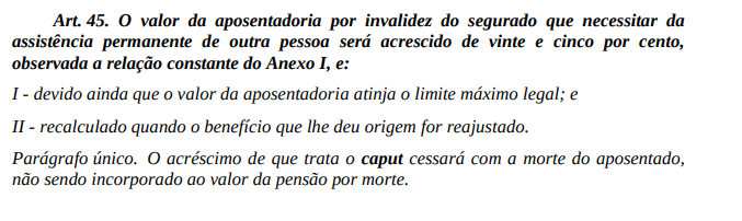 Em acréscimo, no caso de pacientes cuja doença exija permanência contínua no leito e/ou que apresente uma incapacidade permanente para as atividades da vida diária, necessitando, por conseguinte, de assistência permanente de outra pessoa, verificamos o direito de majorar em 25% (vinte e cinco por cento) o valor de sua aposentadoria, ainda que esse montante atinja o limite máximo legal, devendo ser recalculado quando o benefício que lhe deu origem for reajustado.
