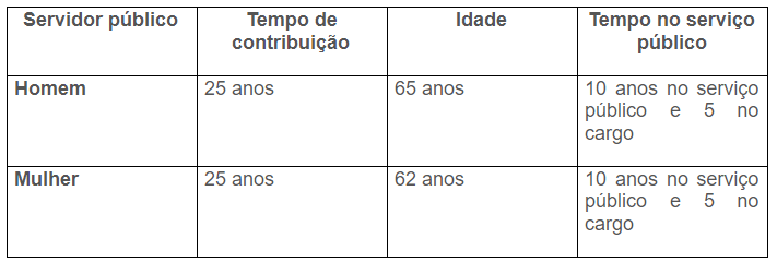 - Regime específico para cada ente federativo: seja a União, os estado ou os municípios, cada um exige, independentemente da entidade, a idade mínima de 55 anos para mulheres e 60 anos para homens, além de 30 e 35 anos de contribuição para mulheres e homens, respectivamente;