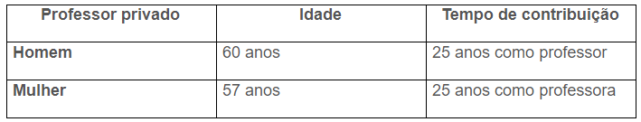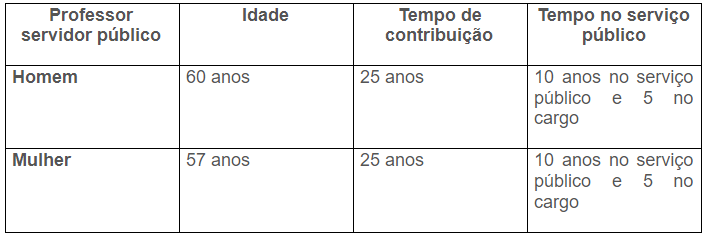 Para os professores, a idade mínima será de 52 anos para as mulheres e 55 para os homens, com um período mínimo de contribuição de 25 anos e 30 anos, respectivamente. Para os servidores, mínimo 20 anos no serviço público e 5 anos no cargo.