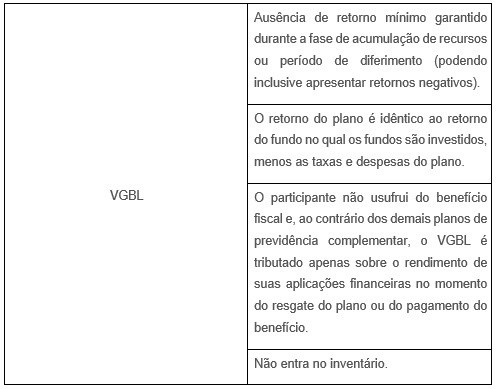 O VGBL é um seguro pessoal que garante cobertura em caso de sobrevivência. Surgiu no mercado brasileiro desde 2001 e foi criado com base no PGBL. A Resolução CNSP 49/01 estabeleceu as regras operacionais e critérios para a operação de planos com cobertura de sobrevivência. Atualmente, os planos com cobertura de sobrevivência, nos quais se enquadra o VGBL, são regulamentados pela Resolução CNSPCNSP nº 348/2017 e pela Circular SUSEP nº 564/2017).