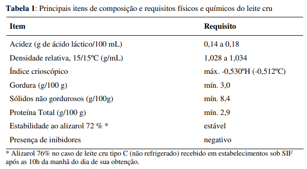 Os Regulamentos Técnicos de Produção, Identidade e Qualidade do Leite Tipo A, do Leite Tipo B e do Leite Tipo C foram aprovados, estabelecendo características dos estabelecimentos produtores, exigências quanto à sanidade do rebanho, higiene e controle da produção, procedimentos específicos para o controle de qualidade da matéria-prima e parâmetros de composição, físicos, químicos e microbiológicos para o leite cru e pasteurizado. Os requisitos de composição, físicos e químicos são os mesmos para todos os tipos de leite cru (tabela 1). Os leites pasteurizados integrais, além de manterem estes padrões, devem apresentar resultado negativo na prova da fosfatase alcalina e positivo na prova da peroxidase.