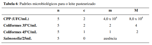 O leite pasteurizado deve apresentar os padrões microbiológicos mostrados na tabela