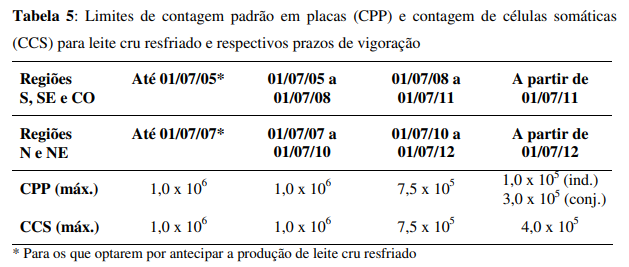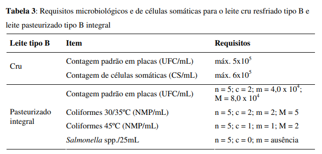 Os parâmetros microbiológicos estabelecidos para leite tipo A e leite tipo B estão demonstrados nas tabelas 2 e 3, respectivamente. A alteração principal refere-se ao estabelecimento de um limite para CCS, não exigida na legislação anterior.