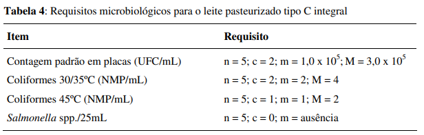 O leite cru tipo C permanece sem nenhuma exigência quanto ao limite de células somáticas e carga microbiana. Os parâmetros microbiológicos para o leite pasteurizado tipo C estão demonstrados na tabela 4.