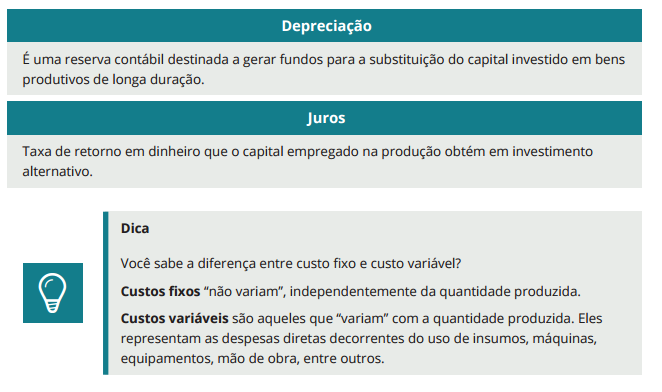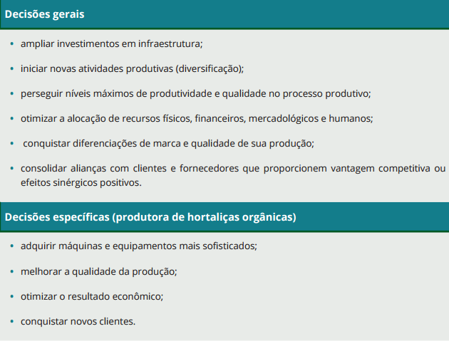 • produção: está diretamente relacionada às atividades que a empresa realiza e aos fatores de produção que utiliza. Na área de produção, administram-se questões físicas, de volume ou quantidade (total ou unitária), como o uso de insumos e outros fatores de produção (horas/máquina, homens/dia, hectares/ano, litros/hectare, entre outros), e a geração de produtos ou serviços (sacas/ano, litros/mês, toneladas/hectare, hospedagens/semana, entre outros);