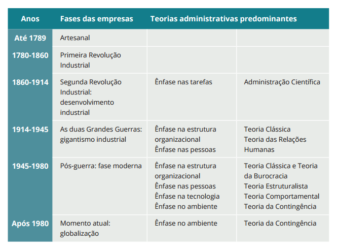 O tratamento da administração como ciência é bastante recente. O período que se iniciou após a Revolução Industrial pode ser resumido em cinco fases distintas, mas que se sobrepõem em alguns momentos, gerando diferentes teorias administrativas. Observe no quadro abaixo a evolução dessas teorias.