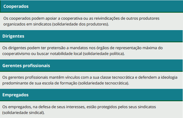 • o interesse político leva a disputas internas pelo poder, como também à representatividade da cooperativa e de seus associados perante a comunidade.