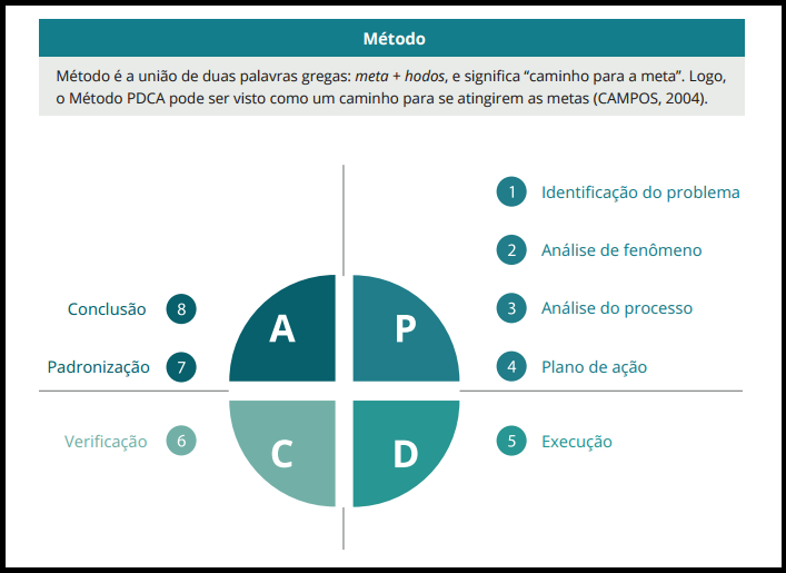 O método PDCA reúne os conceitos básicos da administração, apresentando-os em uma estrutura de ciclo, o que o torna simples de ser compreendido e gerenciado por qualquer organização. Ele visa à melhoria contínua dos processos para atingir os resultados esperados.