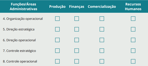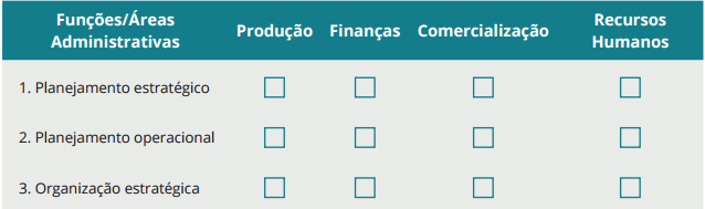 As funções administrativas podem ser classificadas em planejamento, organização, direção e controle. Inicialmente, vamos analisar as características de cada uma; em seguida, faremos uma matriz para analisar em detalhes sua aplicação em setores da organização. Confira no quadro a seguir.