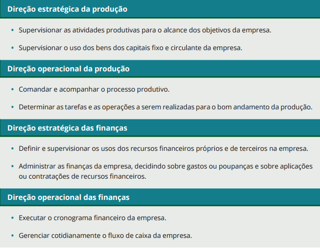 A direção compreende o ato de comandar, gerir ou dirigir a empresa. Ela engloba, entre outras coisas, o ato de supervisionar o uso de todos os recursos da empresa a fim de cumprir a execução das ações planejadas, motivar os trabalhadores, executar em si as tarefas e as operações planejadas, realizar compras e vendas etc.