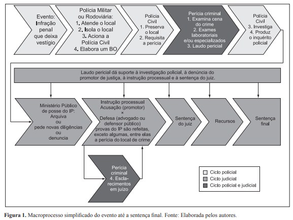 Caulliraux et al. (2004) e Caulliraux, Proença e Lyra Da Silva (2004) mapearam e sequenciaram os macroprocessos desta rede, enfatizando os serviços das Polícias Civil e Militar. Aqui, foram destacadas as principais atividades de cada ator ao longo da rede. Resumidamente (Figura 1), quando há um crime, a Polícia Militar ou Rodoviária é chamada, vai ao local, isola-o e aciona a Polícia Civil, que, então, o assume, preserva-o, requisita a perícia e inicia a investigação. A perícia criminal realiza o seu trabalho, libera o local, e ao final elabora um laudo pericial que integrará o inquérito policial. Durante a investigação, a Polícia Civil busca suspeitos e testemunhas, ouve pessoas, etc. Ao final, o delegado elabora um relatório para o juiz de direito, que o repassa ao promotor de justiça. Este