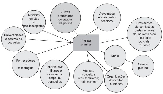 Do ponto de vista da perícia criminal, a participação nesta rede exige que ela se relacione com atores distintos, de diferentes instituições, os quais têm suas próprias prioridades. O fluxo mais intenso de informações e materiais é com a Polícia Civil, pois é o delegado de polícia quem requisita a perícia. Há também o fluxo de informações com o Poder Judiciário, sempre que os juízes requisitam exames e/ou laudos para instruir o processo ou, ainda, respostas a quesitos escritos ou o comparecimento do perito em juízo. A rede entrega um valor de Justiça, que promove a pacificação social, evitando que as pessoas façam justiça com as próprias mãos. Entrega a aqueles que tiveram seus direitos violados uma compensação intangível e, ao mesmo tempo, faz com que, os que ofenderam a lei, respondam e paguem pelos seus atos. O principal usuário final desta rede é a sociedade como um todo, para quem o valor de serviço é a imparcialidade da Justiça. A perícia criminal contribui para esse valor com um insumo – a prova material ou pericial.