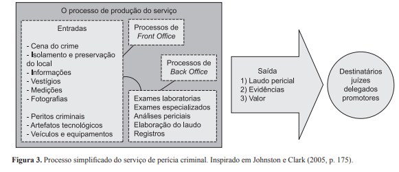 O processo é o script (VOSS; ZOMERDIJK, 2007) do serviço. O processo de produção do serviço (Figura 3) começa com o acionamento da perícia pelo delegado de polícia, realizado por meio do Centro Integrado de Atendimento e Despacho na capital e pelas Delegacias de Polícia no interior. Após o acionamento, o perito identifica a natureza pericial, seleciona o material apropriado e se dirige para o local. Este tempo de deslocamento varia em função da distância, das condições climáticas e da pista. Há cenas de crime que estão próximas à sede, enquanto outras, a mais de 200 km. Portanto, o front office do serviço segue um arranjo posicional (SLACK; CHAMBERS; JOHNSTON, 2002; WILD, 2003; CORRÊA; CAON, 2002), pois os peritos transportam para a cena do crime todo o material específico necessário.