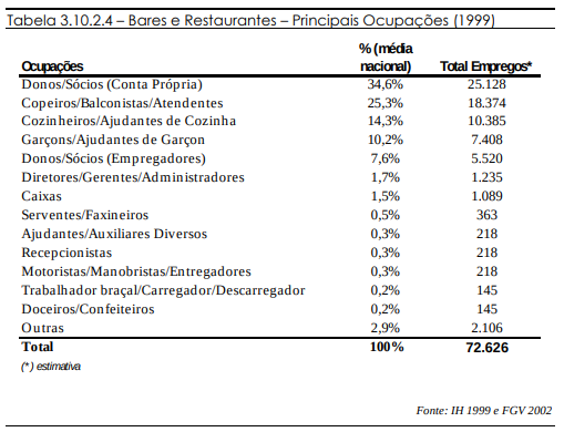 Nas atividades de alimentação, grande parte dos proprietários (donos ou sócios) assume as ocupações existentes (34,6%). Isso demonstra a existência de uma grande quantidade de pequenos empreendimentos que contam muitas vezes apenas com o trabalho do próprio proprietário, com ou sem sócio. Em segundo lugar, aparecem os copeiros, balconistas e atendentes, que representam a grande maioria das ocupações, principalmente dos bares.