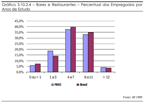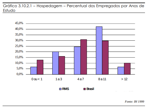 Tais dados demonstram que, em termos de qualificação profissional por anos de estudo, a RMS não tem grandes vantagens sobre o Brasil como um todo. Enquanto a soma dos níveis de 4 a 7 e de 8 a 11 anos de estudo para o Brasil é 61%, para a RMS é de 65%. Isso mostra que a RMS representa bem a situação da capacitação profissional no Brasil como um todo, no setor de hospedagem, ainda que apresente um quadro ligeiramente mais desenvolvido.