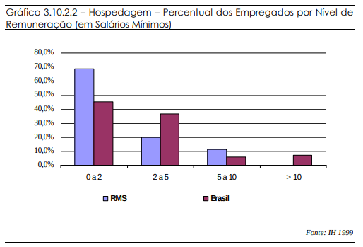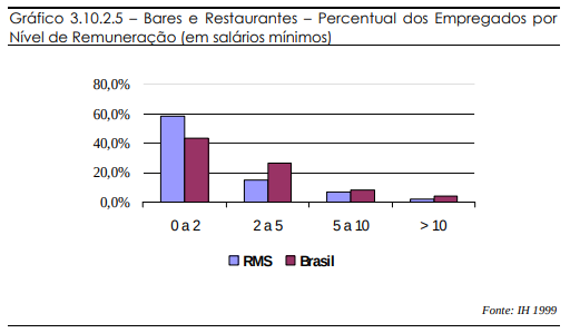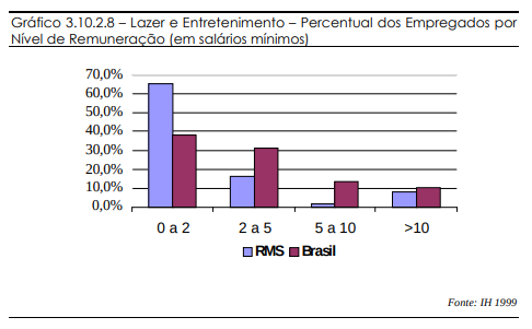 As médias brasileiras apresentam maior equilíbrio entre as duas faixas mais baixas de salário, além de mostrarem uma pequena porcentagem de empregados que recebem mais de 10 salários mínimos. Assim, as médias nacionais obedecem a uma curva mais equilibrada nos níveis de remuneração. A RMS apresenta uma grande concentração de empregados na faixa mais baixa de remuneração, restando pouca representatividade para os níveis maiores.