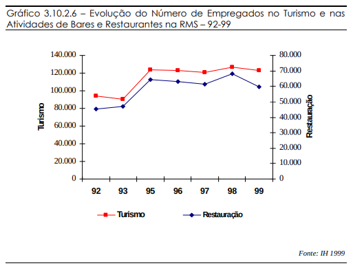 Como dito anteriormente, a geração de empregos do setor de turismo como um todo apresenta um ciclo bastante equilibrado, principalmente a partir do ano de 1995. O setor de alimentação na RMS acompanha o movimento do turismo. No entanto, apresenta tendência a uma pequena queda no final do período, contra uma estabilidade do turismo como um todo.