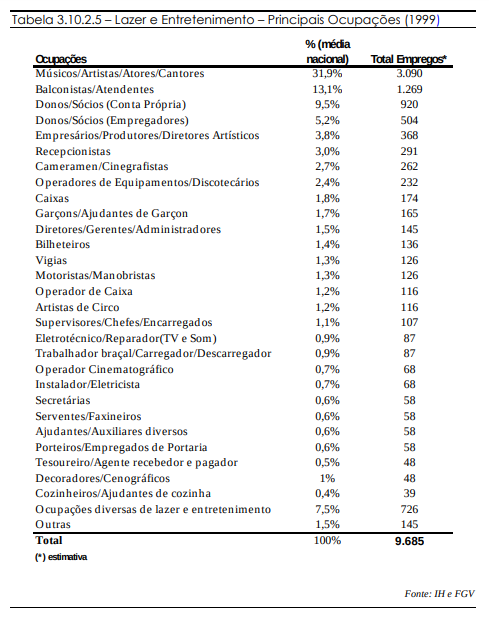 Os cargos e funções do setor de Lazer e Entretenimento estão distribuídos em muitas categorias, sendo que as únicas categorias que representam mais de 10% são as ocupações de Músicos / Artistas / Atores / Cantores e Balconistas / Atendentes, que obtêm, respectivamente, 31,9 e 13,1 % do total de empregos destinados ao ramo de Lazer na RMS.