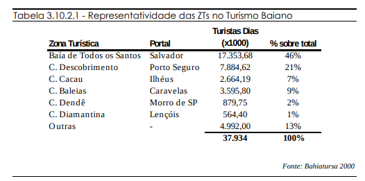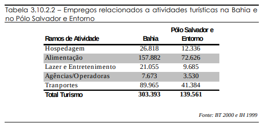 Merece destaque a importância da atividade turística como geradora de empregos na Bahia. Segundo a pesquisa do IH, em 1999, o turismo gerava 5,2% de todos os empregos do estado e 10,4% dos empregos da RMS. Esse índice é um indicador da grande vocação turística da Bahia e principalmente da RMS e do Pólo Salvador e Entorno. É interessante notar que, dividindo-se o número de empregos.