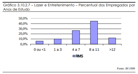 Os trabalhadores das atividades de Lazer e Entretenimento possuem uma média de cerca de 8 anos de estudo, o que representa o 1°grau completo. Dentre as cinco categorias estudadas na pesquisa, essa apresenta a segunda melhor média, ficando abaixo apenas das agências de viagens e empresas de turismo, categoria na qual a média atinge cerca de 10 anos de estudo.